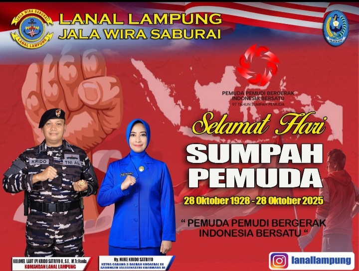 • Lanal Lampung, Jala Wira Saburai, Mengucapkan Selamat Hari Sumpah Pemuda 28 Oktober 2025 “Pemuda Pemudi Bergerak Indonesia Bersatu”